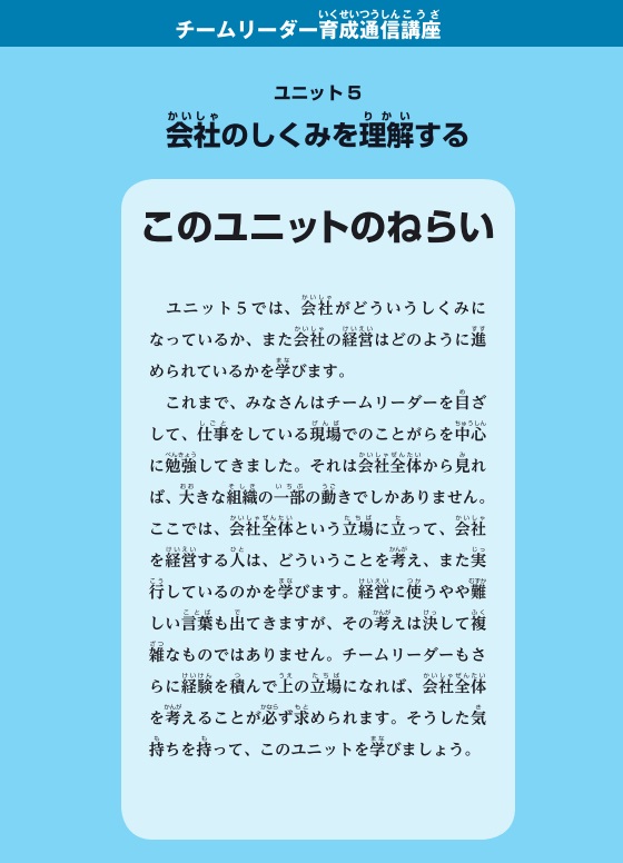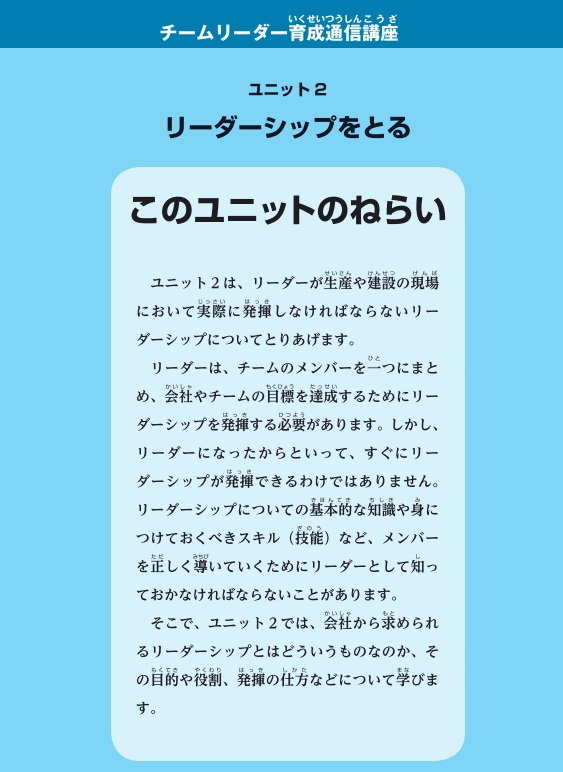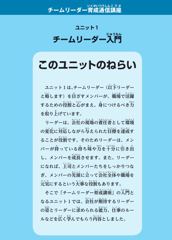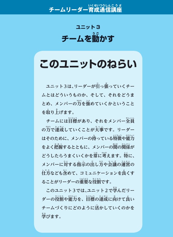| ●講座の内容: | テキスト「チームリーダー入門」を学習し、2つの課題(作文含む)の提出によって行われます。 |
