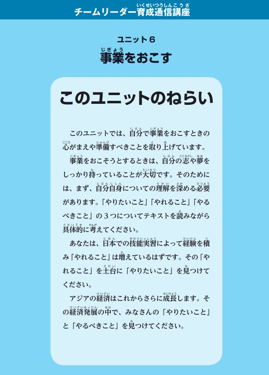 国際的な視点に立って人材の育成を目指す当財団は、これを機に、技能実習生がチームリーダーとして母国の経済発展に寄与するために必要な知識や能力そして考え方を身につけてもらうための通信教育講座を開設することといたしました。
