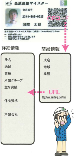 マイスター会員カードのQRコードから所属企業履歴・所有資格等のデータがパケット通信により携帯電話でご確認いただけます。