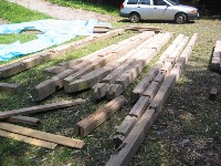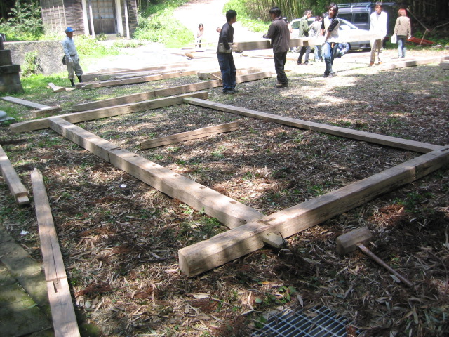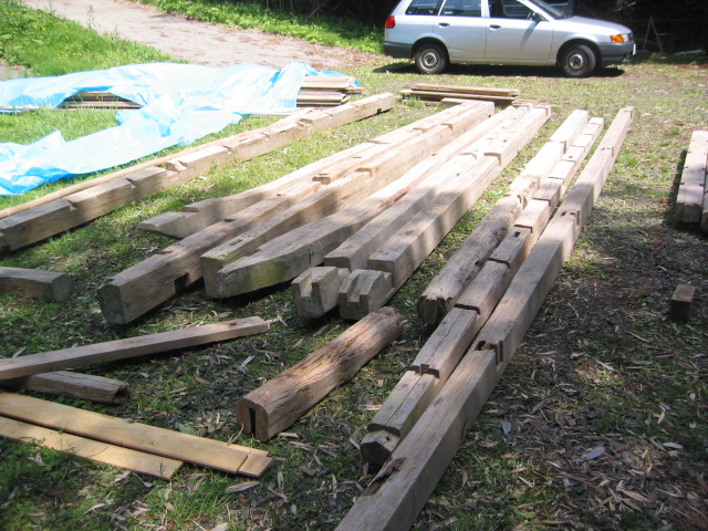 組み立て前の部材。番付け確認に一苦労。