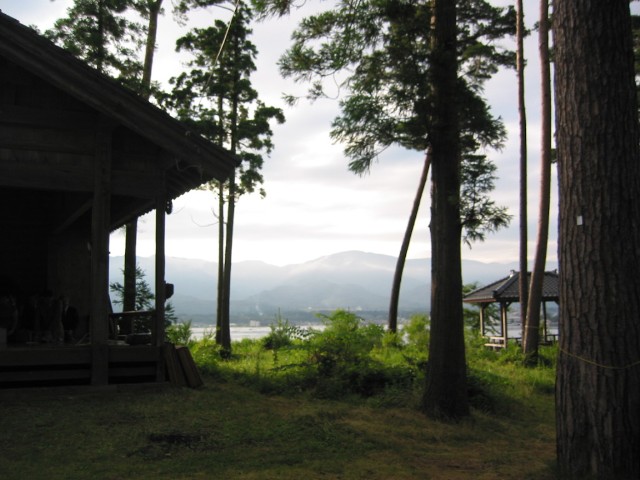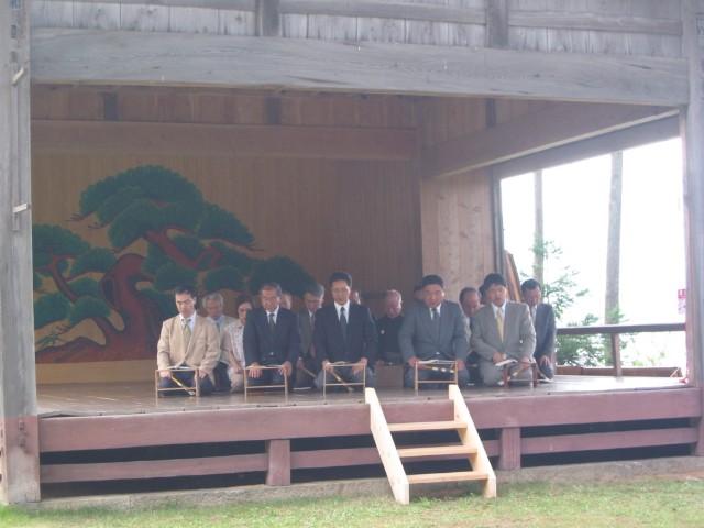 △能舞台の背後には加茂湖が見えます。
