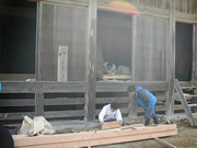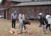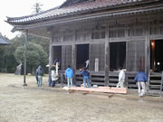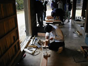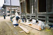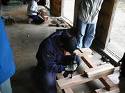 金輪継・框束の作成 3日目に入り受講生も大分打ち解けてきて、実習にも慣れてきました。この日は前日の金輪継に加え、框束の作成を始めました。 ただあいにくの天気で、晴れ、くもり、雨、ひょう、あられ、雪と一日のうちで空模様が次から次へと変わり、拝殿の中で作業を行うなど雨やあられをうまくかわしながら、午前も午後も実習を行いました。