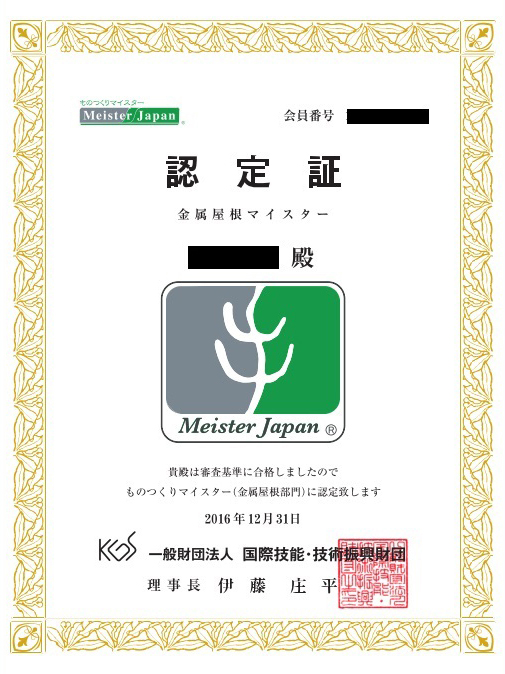 「ものつくりマイスター」金属屋根部門として、優れた製品と技術、高い技能を生かし、高品質のものつくりを実現することが競争力を高め、職人の地位や積算単価の向上につながるとの考えのもと発足しました。